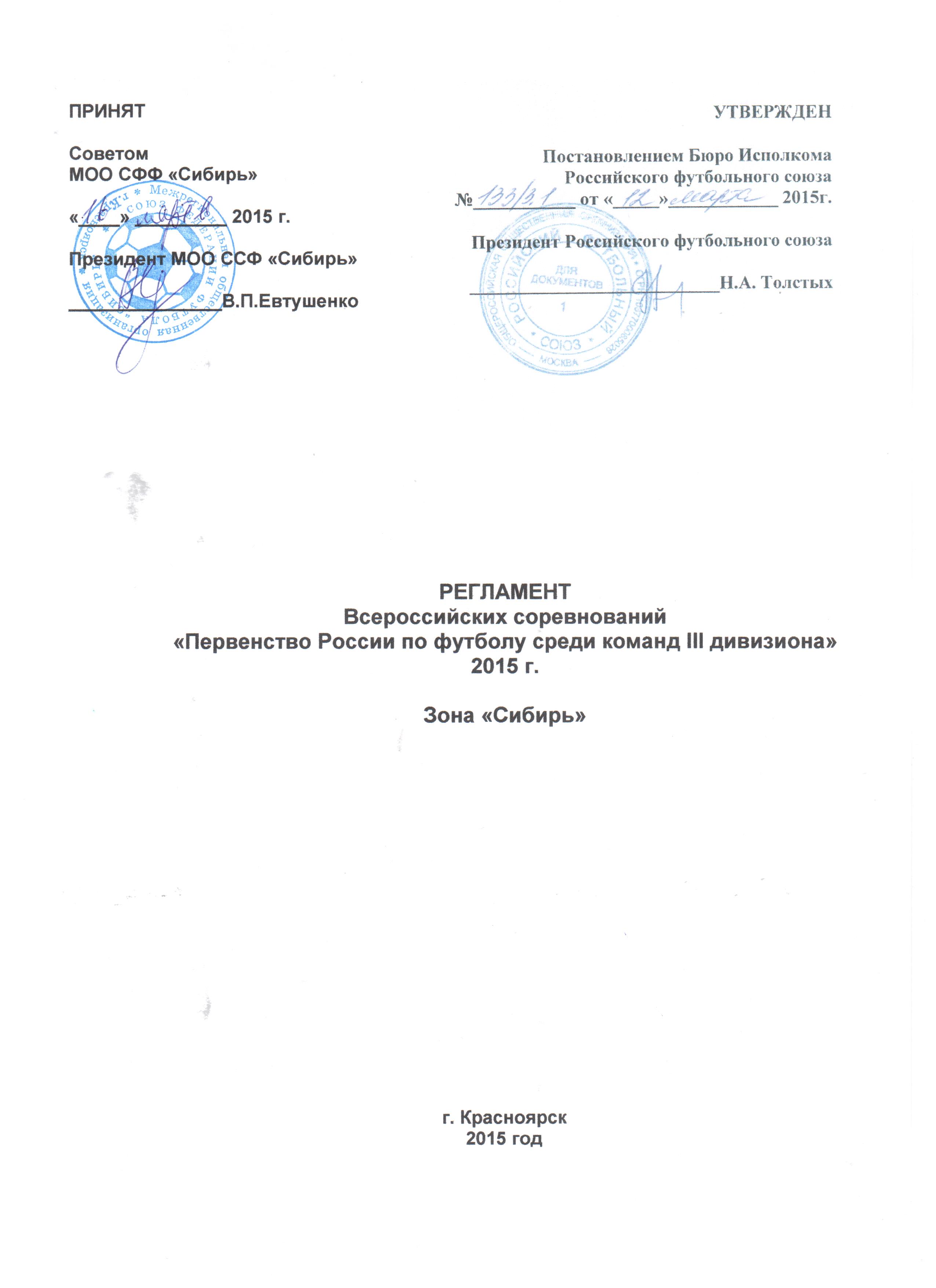 В разделе "Документы" размещены: Регламент Всероссийских соревнований "Первенство России по футболу среди команд III дивизиона" 2015 года и Регламент Всероссийских соревнований "Кубок России по футболу среди любительских команд III дивизиона" 2015 года. Зона "Сибирь".