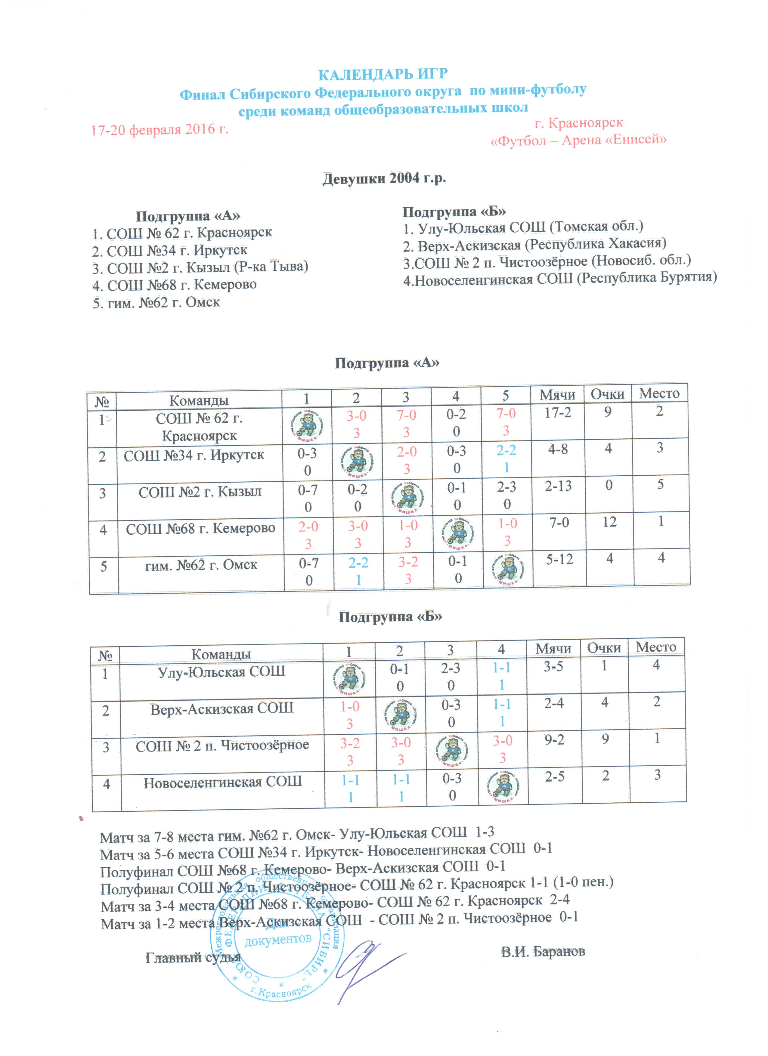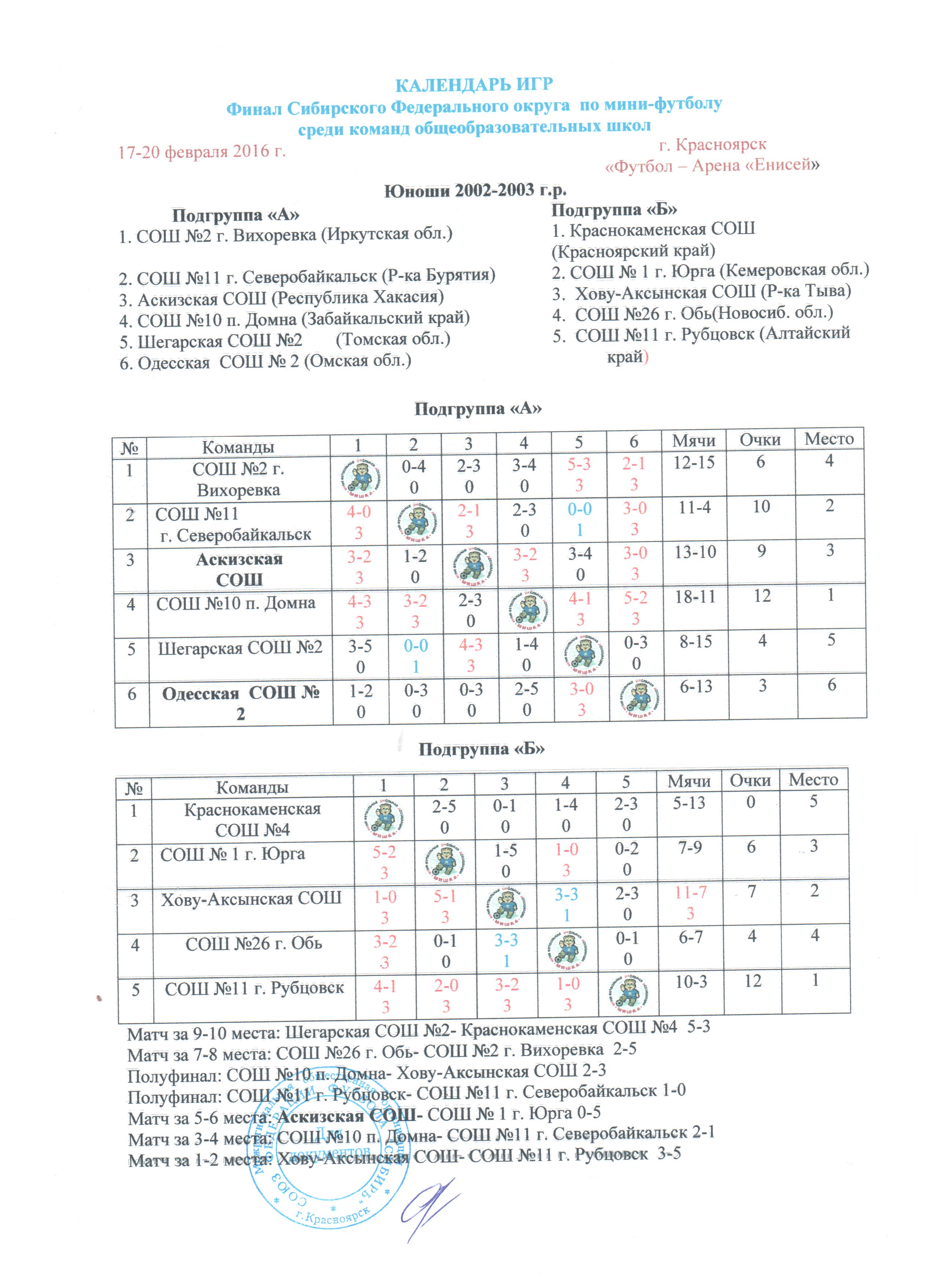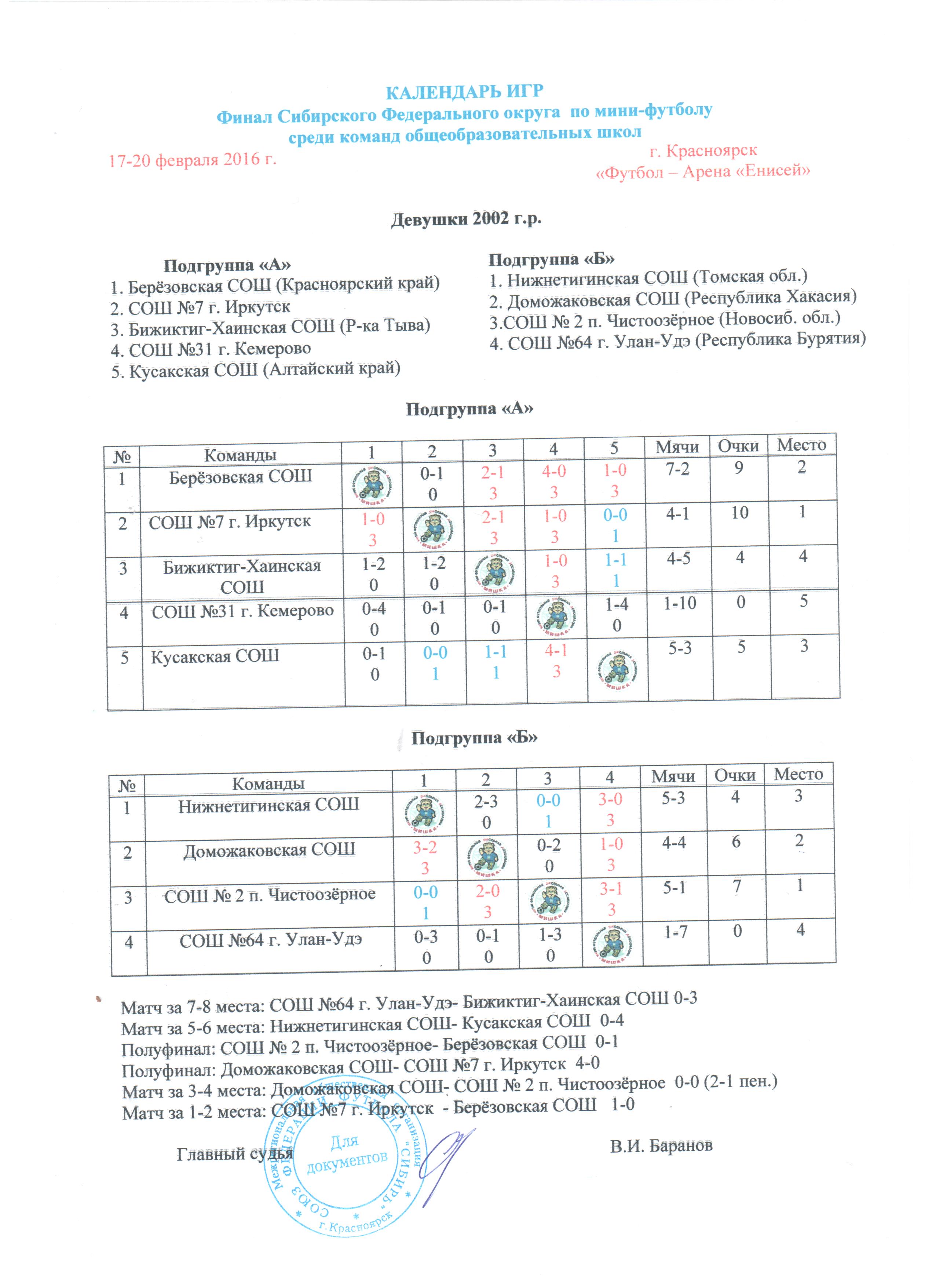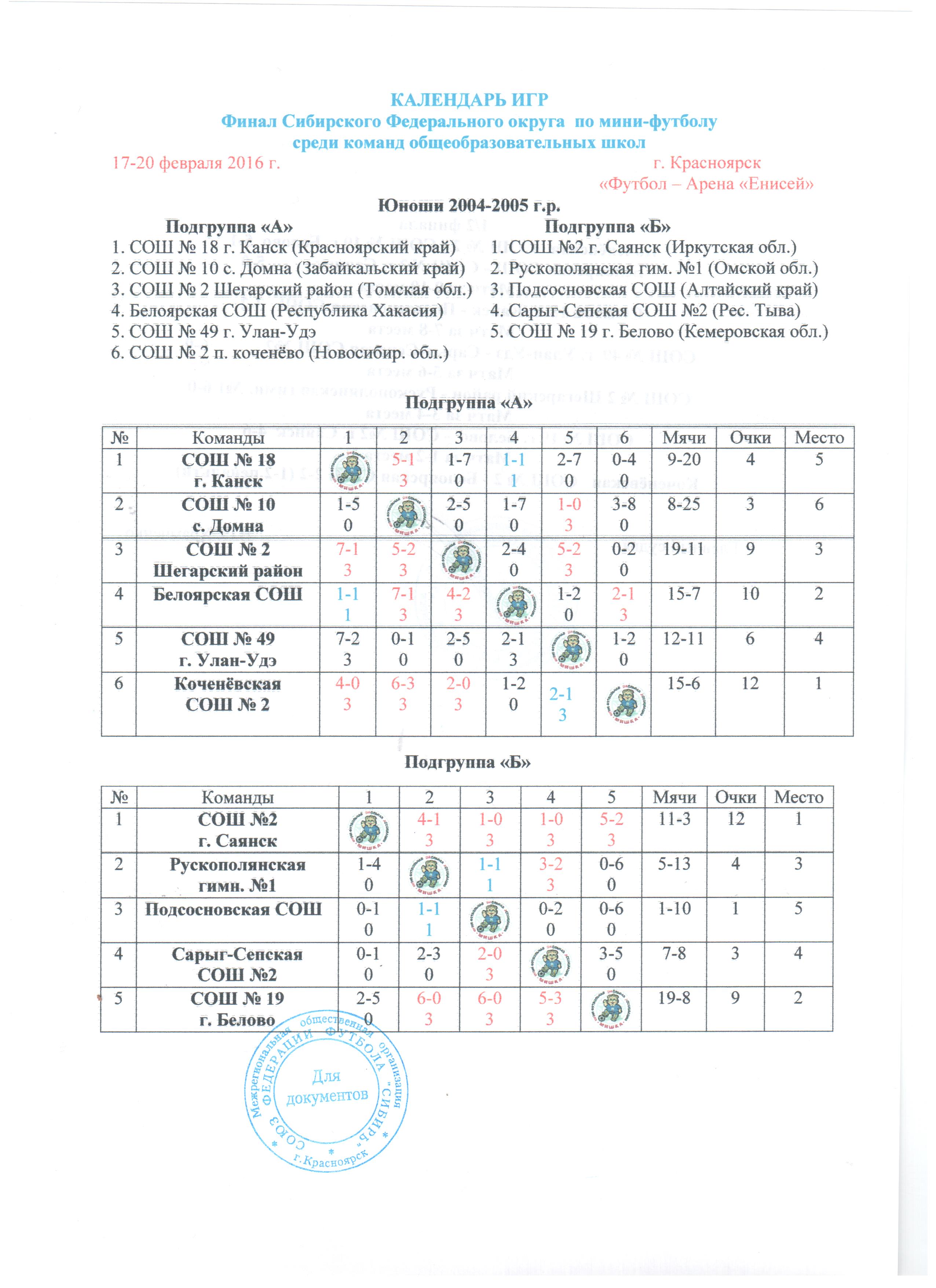 С 17 по 20 февраля 2016 года в КФМ "Футбол-Арена "Енисей" г. Красноярска проходили соревнования общероссийского проекта "Мини-футбол в школу" среди учащихся общеобразовательных школ Сибирского федерального округа. В турнире приняли участие девушки и юноши 2002-2003 и 2004-2005 г.г. рождения из Республик Бурятия, Тыва и Хакасия, Алтайского, Забайкальского и Красноярского краёв, Иркутской. Кемеровской, Новосибирской, Омской и Томской областей. Победителями соревнований стали: девушки 2004-2005 г.г. рождения - СОШ № 2 (пгт. Чистоозёрное, Новосибирская область), мальчики 2004-2005 г.г. рождения - Белоярская СОШ (Республика Хакасия), девушки 2002-2003 г.г. рождения - СОШ № 7 из г. Иркутска, юноши 2002-2003 г.г. рождения - СОШ № 11 (г. Рубцовск, Алтайский край). С 24 по 27 февраля 2016 года к вышеперечисленным командам добавятся ещё четыре - победители в старших возрастных группах - 1998-1999, 2000-2001 г.г. рождения. Игры с участием девушек и юношей также пройдут под сводами КФМ "Футбол-Арены "Енисей". Финальный аккорд соревнований с участием сильнейших команд учащихся СОШ России пройдёт с 23 по 30 марта 2016 года в г. Москве и Московской области.