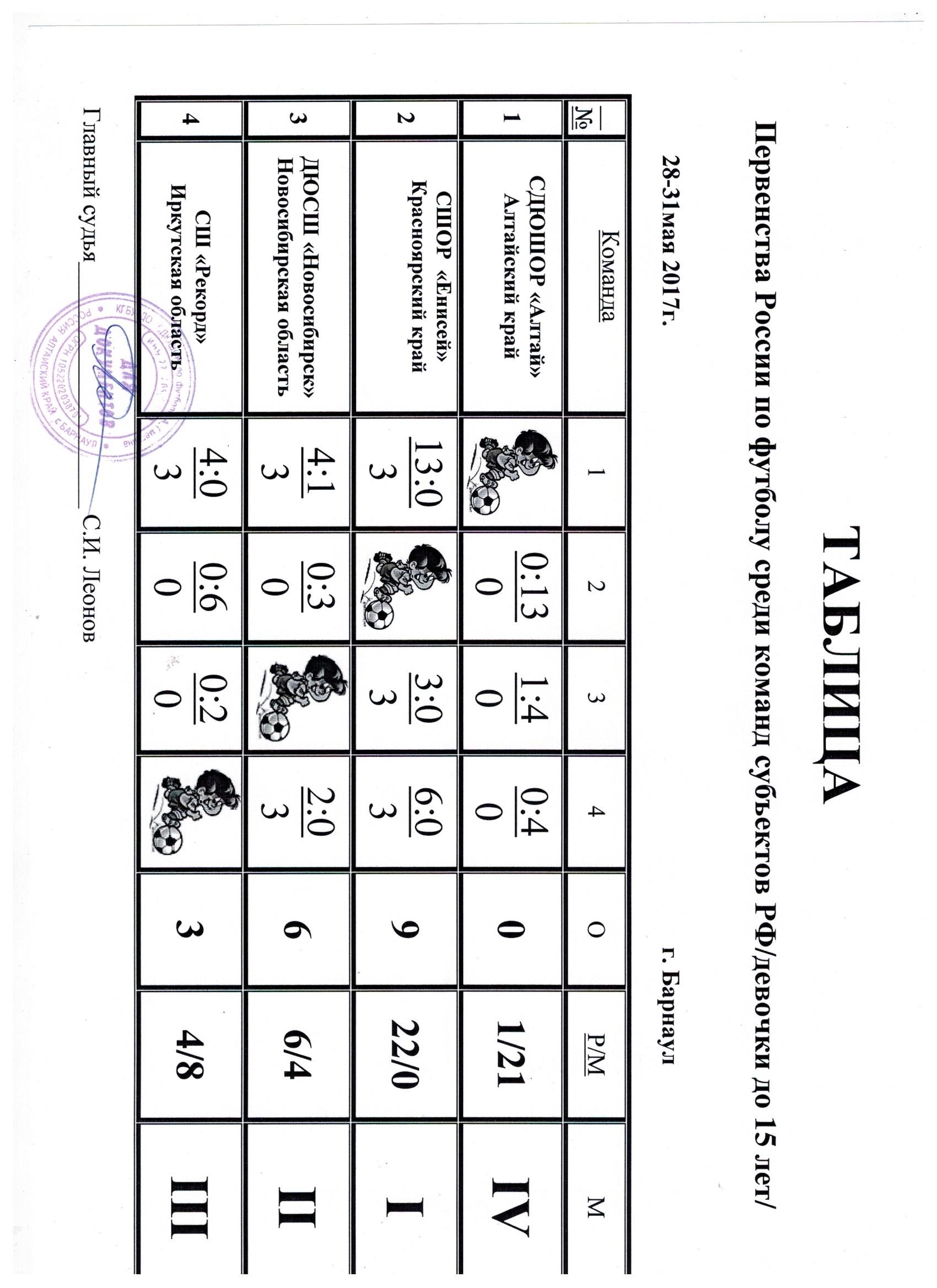 С 28 по 31 мая 2017 года в городе Барнауле прошли соревнования первенства России по футболу среди команд девушек до 15 лет. В турнире приняли участие четыре команды. Первое место заняла команда "Енисей" (Красноярск), одержавшая победы во всех матчах с общим счётом 22:0. Второе место у команды ДЮСШ (Новосибирск), на третьем месте "Рекорд" (Иркутск), на четвёртом - "Алтай" (Барнаул). Лучшими игроками признаны: вратарь - Дарья Сизова ("Рекорд" Иркутск), защитник - Кристина Голощёкова (ДЮСШ Новосибирск), полузащитник - Ника Белова ("Енисей" Красноярск), бомбардир - Дарья Челазнова («Енисей» Красноярск), лучший игрок - Вероника Калиниченко («Алтай» Барнаул).