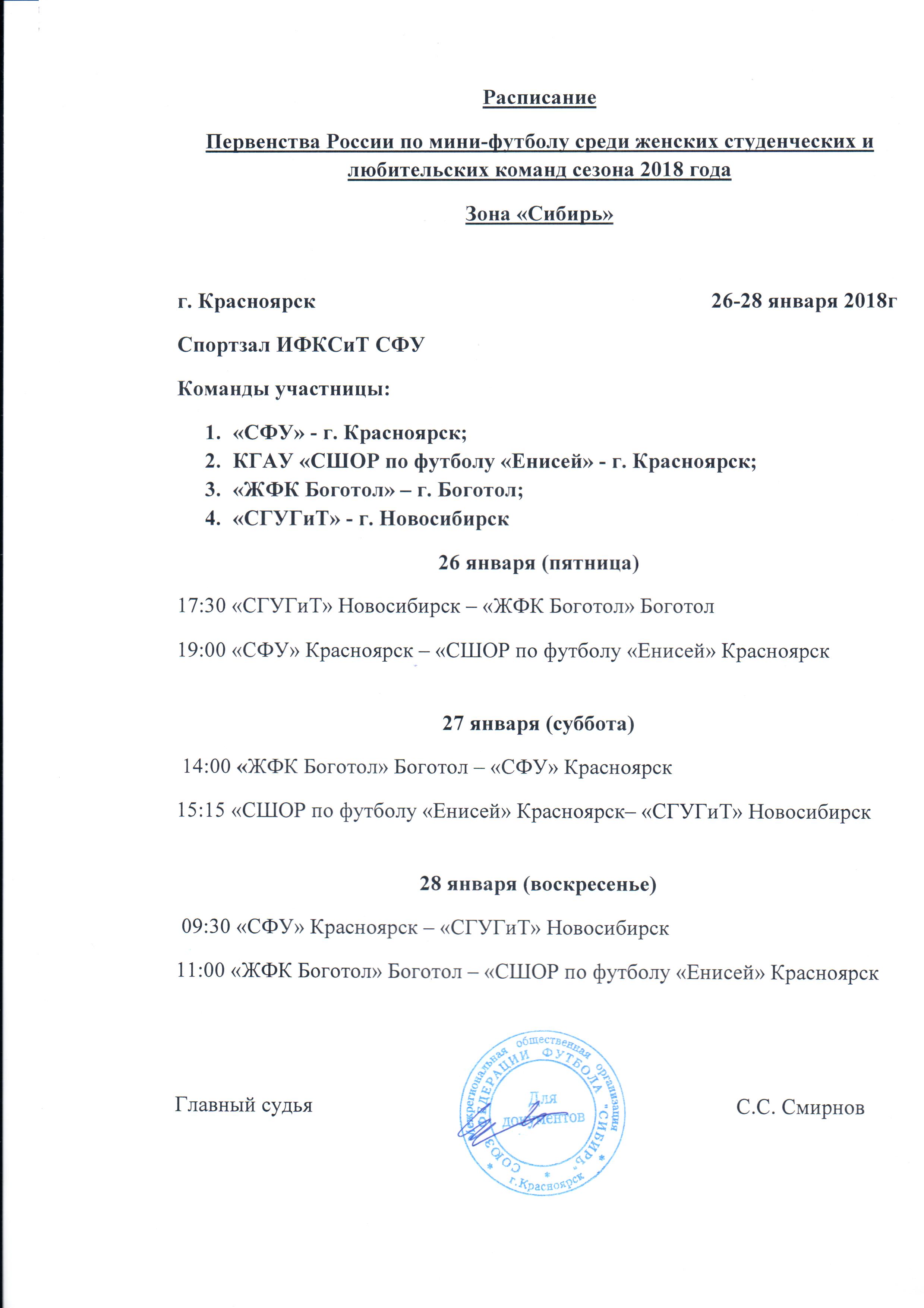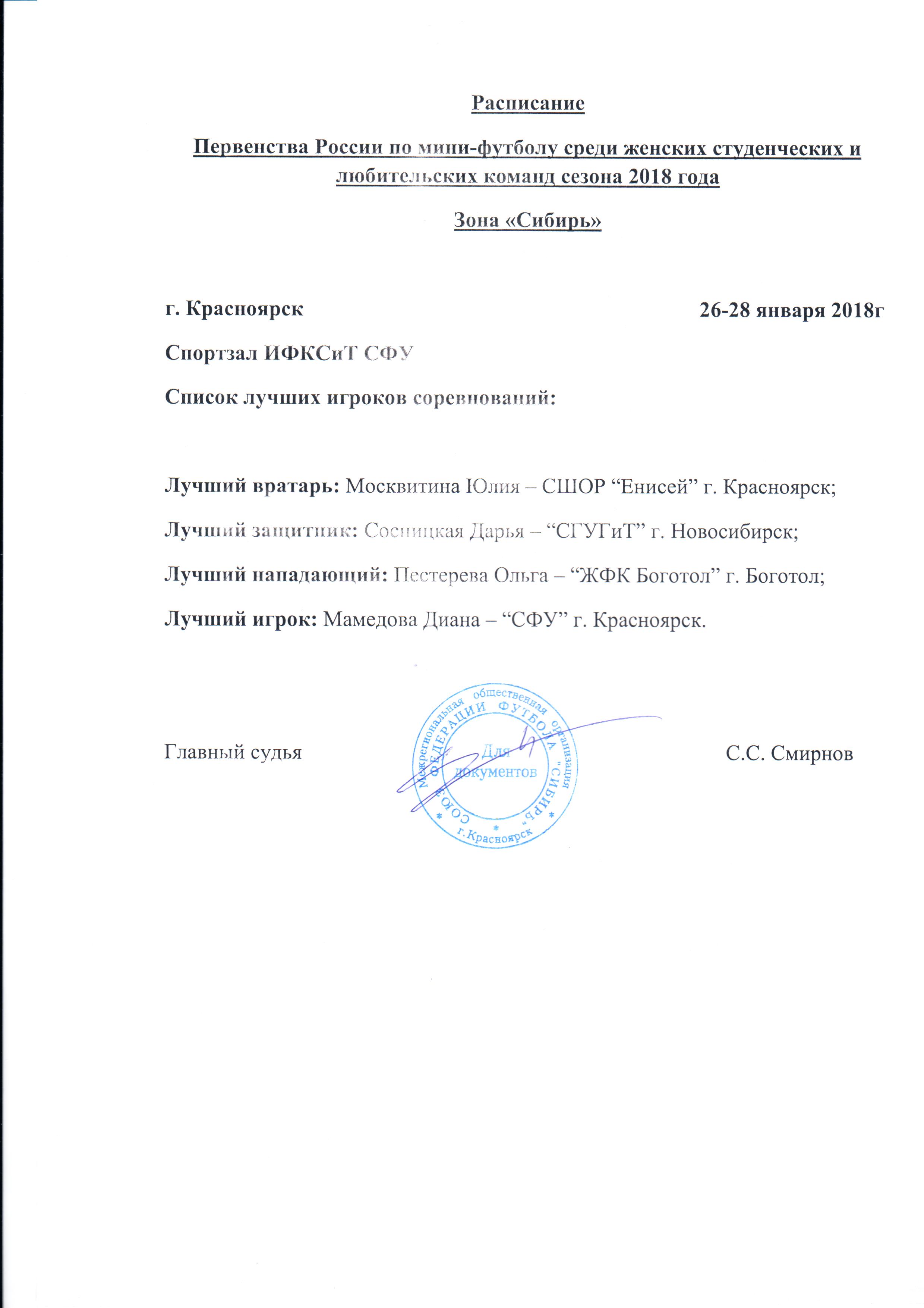 В период 26-28 января 2018г. в СК "СФУ" г. Красноярск, прошли соревнования "Первенства России по мини-футболу среди женских любительских команд (1 лига) зона "Сибирь" 2018г." Итоги соревнований можете посмотреть ниже.